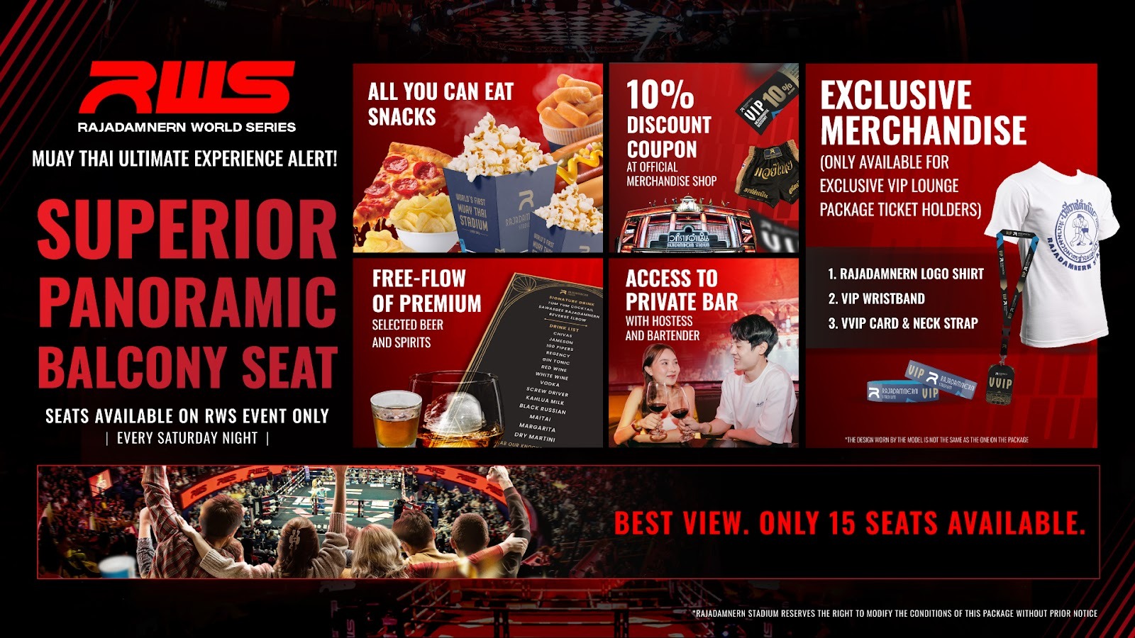 Out of 3500 seats, only 15 superior panoramic balcony seats are available each night. You will be seated at Rajadamnern VIP Lounge with the best panoramic view of the stadium with best view of an action. Extra special for the RWS event! Enjoy a free-flow of premium selected beer and spirits, unlimited snack, exclusive Rajadamnern merchandise gift-set and much more. It is a Muay Thai experience like no other. Will you be that lucky 15?